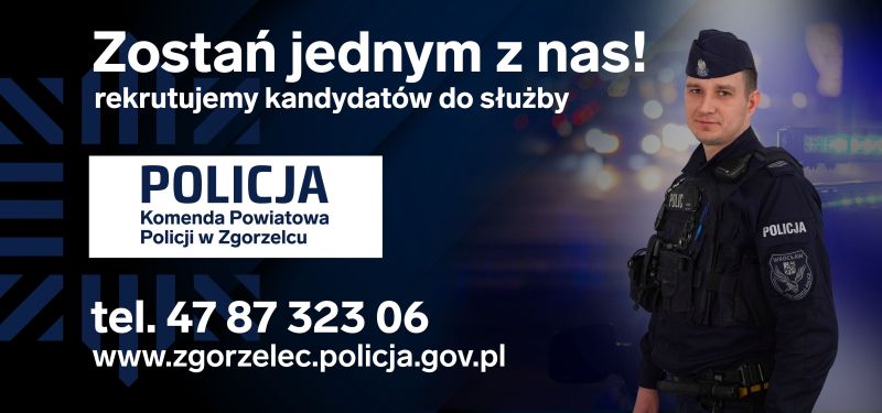 Przypominamy, że nabór do służby w policji trwa cały rok. Chcesz spróbować swoich sił skontaktuj się z Komendą Powiatową Policji w Zgorzelcu pod numerem telefonu: 47 87 322 14 lub 47 87 323 06, a powiemy Ci jak przystąpić do rekrutacji.