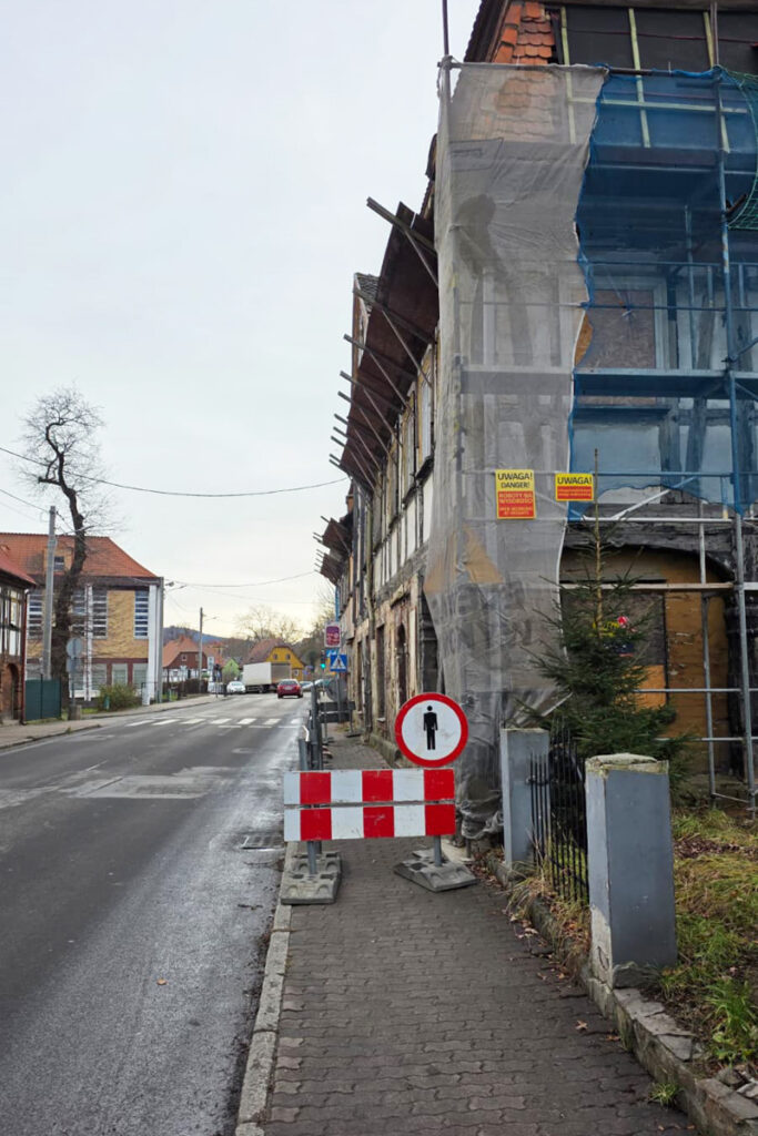 W rejonie remontowanego obiektu obowiązuje zakaz poruszania się pieszo wzdłuż budynku oraz ograniczenie prędkości do 30 km/h.