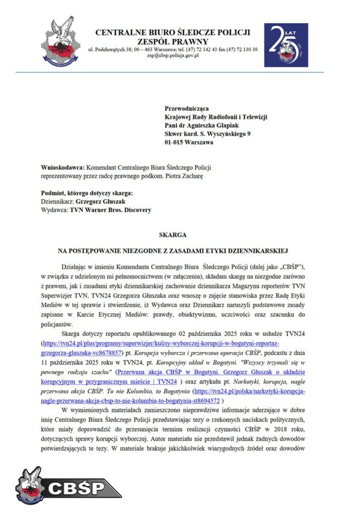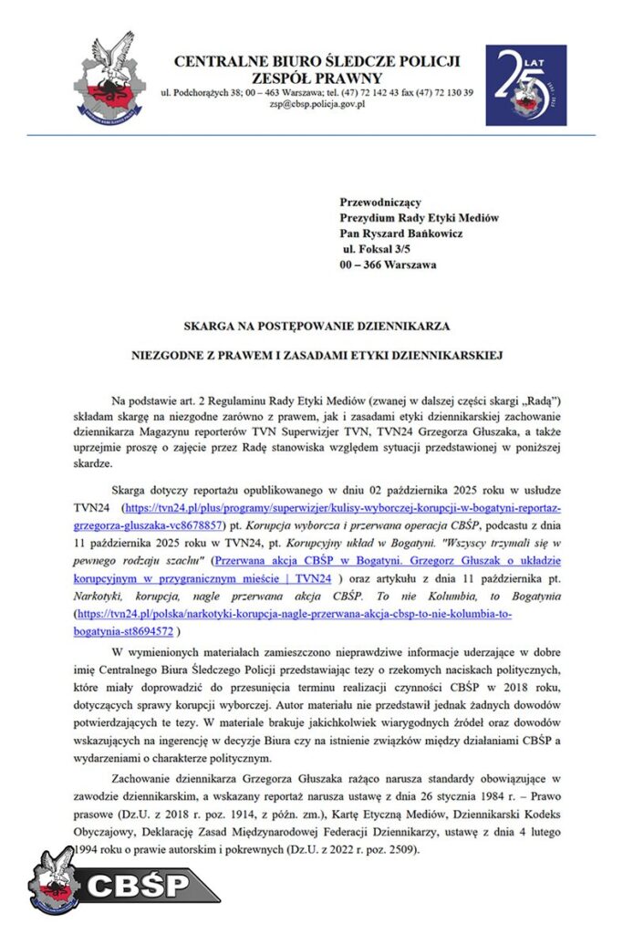 W dniu 02 października 2025 r. oraz 11 października 2025 r. na platformie internetowej w TVN24 i na portalach internetowych Grupy Warner Bros Discovery Poland opublikowano materiały prasowe w postaci reportażu Grzegorza Głuszaka pt. „Korupcja wyborcza i przerwana operacja CBŚP”, pt. „Korupcyjny układ w Bogatyni. Wszyscy trzymali się w pewnego rodzaju szachu” oraz pt. „Narkotyki, korupcja, nagle przerwana akcja CBŚP. To nie Kolumbia, to Bogatynia”. Poszczególne tytuły wskazują na powiązania korupcyjne Centralnego Biura Śledczego Policji z władzami samorządowymi w Bogatyni. Materiał jest nieprawdziwy i nieetyczny, a autor Grzegorz Głuszak nie zadał sobie trudu rzetelnego ustalenia stanu faktycznego, łącząc w jeden temat kilka niezwiązanych ze sobą informacji w celu osiągnięcia swojego partykularnego interesu, kosztem naruszenia dobrego imienia CBŚP i dóbr osobistych służących w nim policjantów, narażając ich po emisji materiału na ostracyzm i negatywny odbiór opinii publicznej.