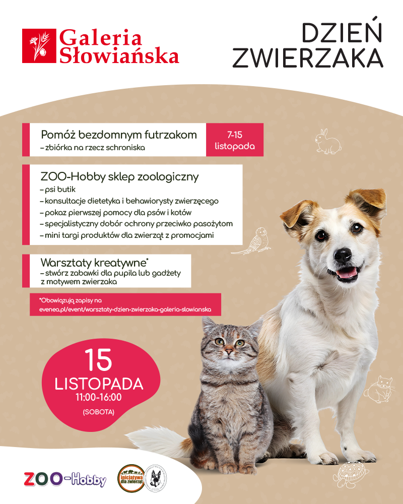 Warsztaty będą prowadzone w grupach, trwają ok. godziny. Udział w warsztatach jest bezpłatny, jednak obowiązują zapisy online: https://evenea.pl/event/warsztaty-dzien-zwierzaka-galeria-slowianska