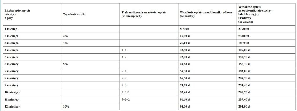- Odbiornik radiowy – stawka 8,70 zł za 1 miesiąc lub 94 zł za cały rok;