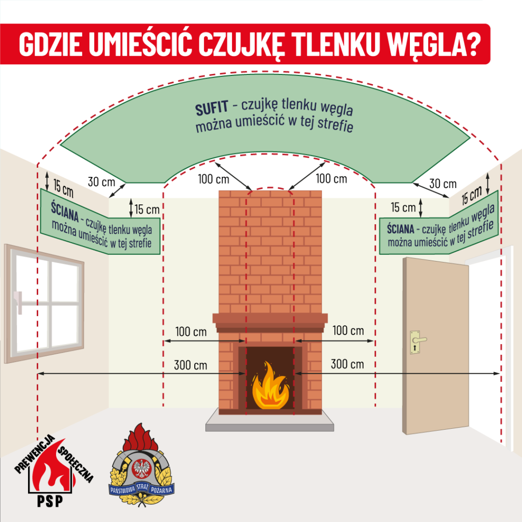 Czujki tlenku węgla powinny być montowane zgodnie z zaleceniami producenta, najczęściej na wysokości wzroku, min. 1,5 m od podłogi oraz ok. 2 m od urządzeń mogących być źródłem tlenku węgla. Detektorów tych nie należy montować zarówno w tzw. martwych przestrzeniach, (np. wnękach zasłoniętych przez meble czy zasłony, w szczycie dachu, itp.), jak i tam gdzie jego działanie będzie zakłócone przez bezpośredni dopływ świeżego powietrza (np. w pobliżu drzwi, okien, kratek wentylacyjnych, wentylatorów). Urządzeń tych nie powinno się również umieszczać, w miejscach narażonych na działanie kurzu, brudu, aerozoli i domowych chemikaliów oraz w pomieszczeniach o dużej wilgotności powietrza. Liczba czujników tlenku węgla, jakie należy zamontować w budynku zależy od wielu czynników, m.in.: ilości i lokalizacji urządzeń mogących być źródłem CO, układu budynku ilości sypialni. Generalną zasadą jest rozmieszczenie czujników w taki sposób, aby w przypadku ich zadziałania sygnał był słyszalny w sypialniach. Tak więc jeżeli w budynku będzie się znajdował tylko jeden detektor CO powinno się go instalować na korytarzu w pobliżu sypialni lub w samej sypialni.