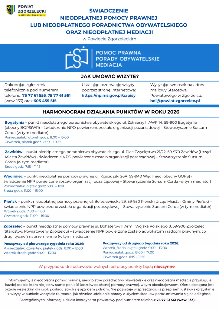 Harmonogram działania zgorzeleckiego punktu nieodpłatnej pomocy prawnej, nieodpłatnego poradnictwa obywatelskiego oraz nieodpłatnej mediacji w roku 2026