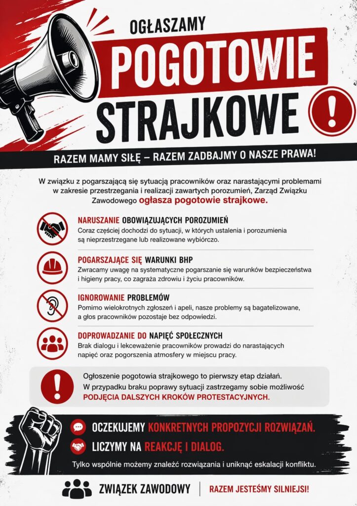 W związku z pogarszająca się sytuacją pracowników oraz narastającymi problemami w zakresie przestrzegania i realizacji zawartych porozumień informujemy o ogłoszeniu pogotowia strajkowego.
