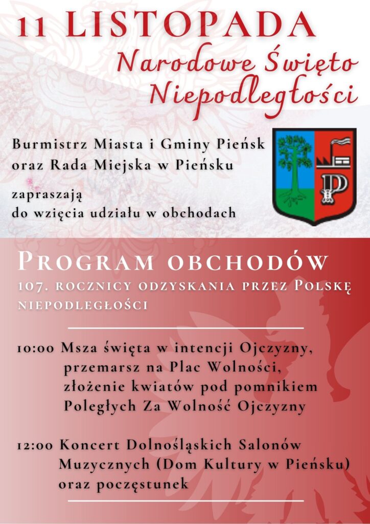 10:00 – Msza święta w intencji Ojczyzny, następnie przemarsz na Plac Wolności i złożenie kwiatów pod pomnikiem Poległych Za Wolność Ojczyzny.