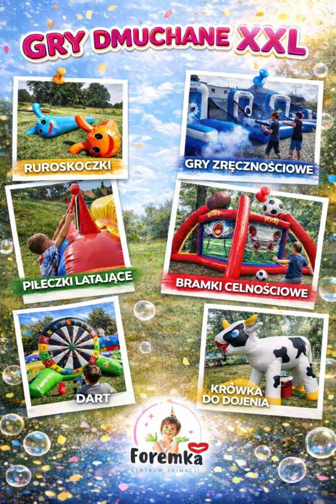 Tym razem dla dzieci jest przewidzianych bardzo dużo ciekawych atrakcji na boiskach przy hali sportowej: dwa duże dmuchańce, dmuchane place zabaw, klocki XXL, duże bańki mydlane, bujaczki dla całkiem malutkich dzieci wszystkie te animacje zapewni Centrum Animacji dla Dzieci Foremka (w załączeniu fotki przykładowych atrakcji – a co dokładnie będzie przekonajcie się sami. Dodatkowo: wata cukrowa, popcorn.