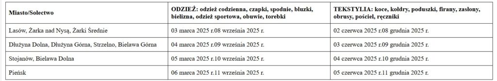 Harmonogram odbioru odpadów komunalnych gminy Pieńsk: tekstylia i odzież w 2025r. Od 1 stycznia 2025r. zużytych ubrań, butów czy elementów tekstylnych nie wrzucamy do pojemnika na odpady zmieszane. Odpady te zbieramy do worka, który można pobrać w Punkcie Obsługi Klienta lub pok. nr 24 UMiG Pieńsk