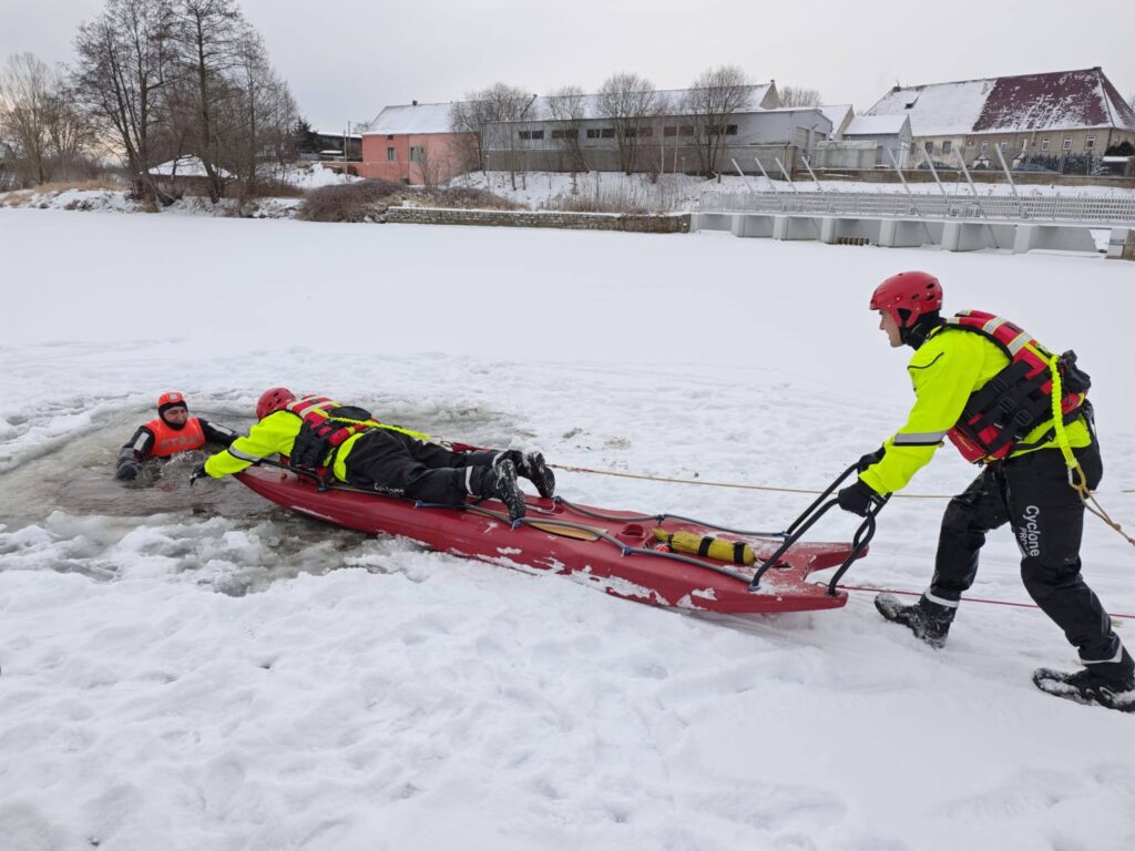 Strażacy doskonalili techniki poruszania się po zamarzniętych akwenach, obsługę sani lodowych oraz bezpieczne wyciąganie osób, pod którymi załamała się tafla.