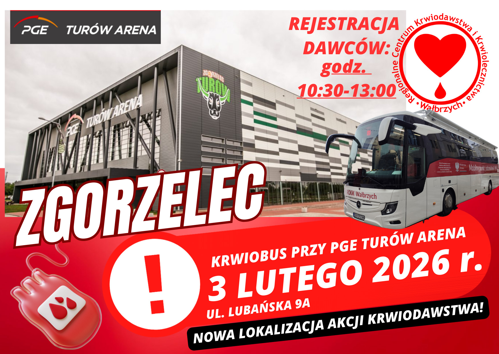 Od początku 2026 roku zmienia się miejsce organizacji comiesięcznych akcji krwiodawstwa w Zgorzelcu. Już od 3 lutego 2026 r. krwiobus Regionalnego Centrum Krwiodawstwa i Krwiolecznictwa będzie stacjonował na parkingu przy PGE Turów Arena, a nie – jak dotychczas – przy Centrum Sportowo-Rekreacyjnym. Zmiana lokalizacji możliwa jest dzięki uprzejmości Zarządu CSR Sp. z o.o.