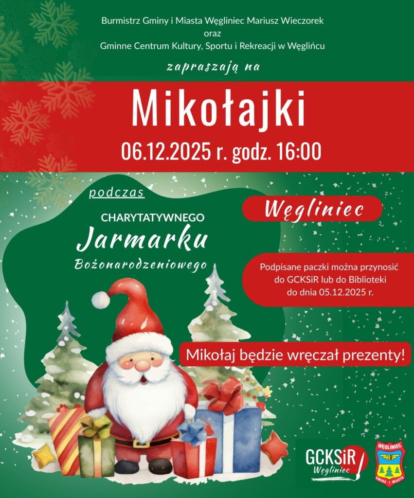 Jeśli chcecie, aby Mikołaj wręczył Wasze przygotowane prezenty, prosimy o dostarczenie podpisanych paczek do GCKSiR lub do Biblioteki w Węglińcu najpóźniej do 5 grudnia 2025 r.