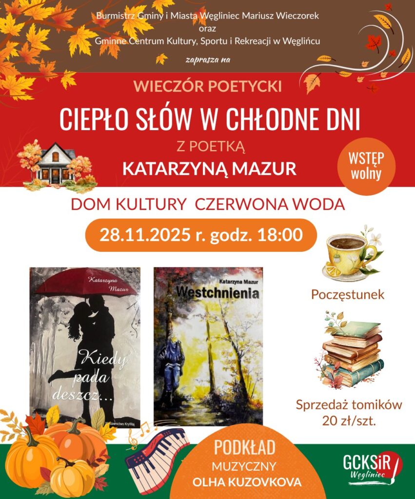 Ten wyjątkowy wieczór poezji to doskonała okazja, by w miłym towarzystwie spędzić listopadowy czas, wsłuchując się w poetyckie słowa przy akompaniamencie muzyki na żywo. Nie może Cię zabraknąć – dołącz do nas i weź udział w tym ciepłym, poetyckim spotkaniu!