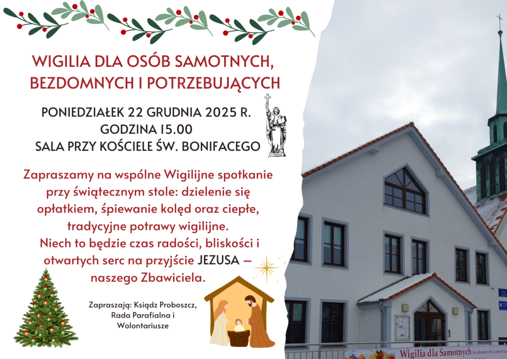 Serdecznie zapraszamy na wspólne wigilijne spotkanie przy stole: dzielenie się opłatkiem, śpiew kolęd oraz tradycyjne potrawy wigilijne.