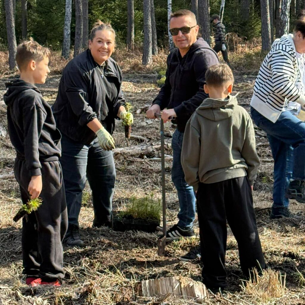 Z ogromnym zaangażowaniem posadzono młode drzewa – brzozy, sosny i świerki, które w przyszłości stworzą piękny, zdrowy las.