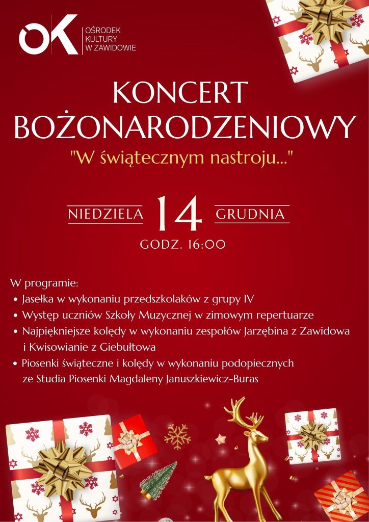 W tym magicznym czasie zapraszamy na Tradycyjny Koncert Bożonarodzeniowy „W świątecznym nastroju…”, który odbędzie się w niedzielę, 14 grudnia o godz. 16:00 w sali widowiskowej Ośrodka Kultury.