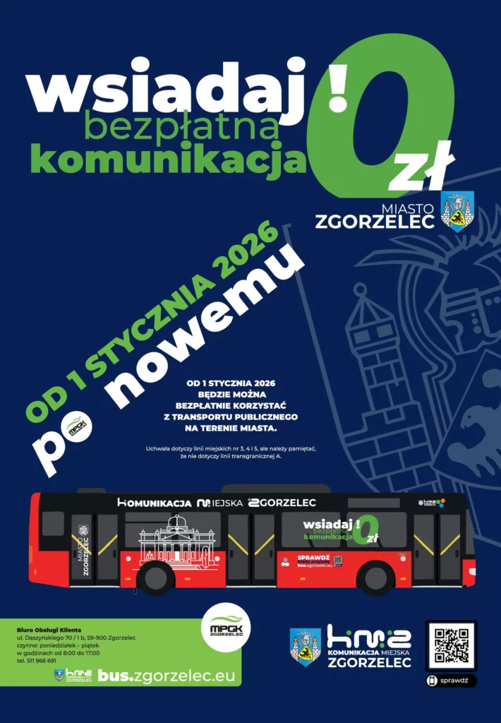 - Nowe pojazdy komunikacji miejskiej to trzy czerwone autobusy, oznakowane znakami Komunikacja Miejska Zgorzelec – „wsiadaj bezpłatna komunikacja 0 zł”.